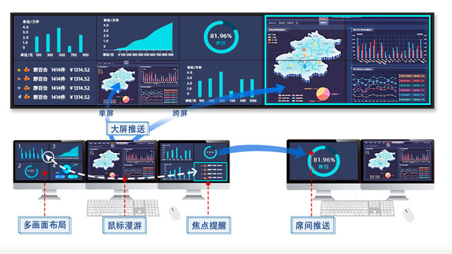 信源可视化预览,多方式快速导览;大屏可视化布局,所见即所得,支持多画面合成、画中画、跨屏、漫游、底图;布局预案编制,一键快速调取。